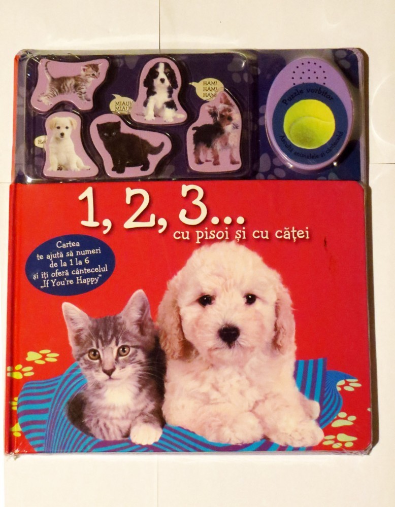 * Carte-joc pentru copii (foarte) mici. Contine o tabla de puzzle, cartonase cu pisici si catei de diverse rase/culori, precum si un mini-difuzor, de unde se aud sunetele.
