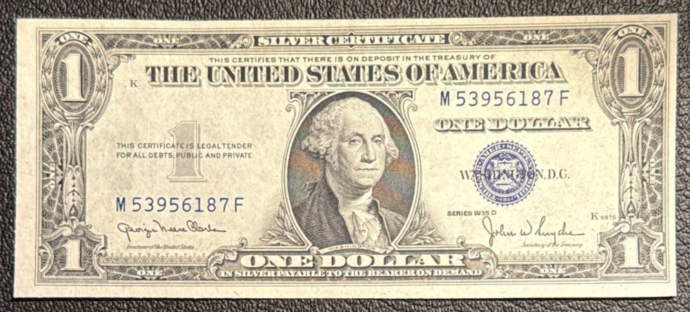 1 DOLLAR 1935 D ,,SILVER CERTIFICATE" STATELE UNITE/(,,M53956187F") SIGILIU ALBASTRU (BLUE SEAL)!