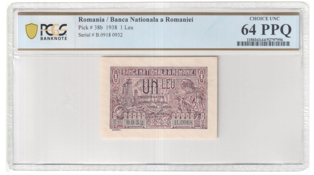 1 leu 1938 PCGS64 UNC bancnota gradata