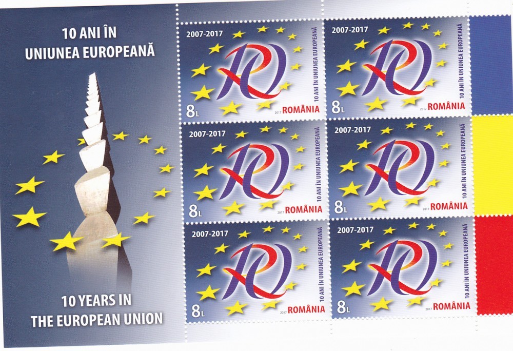 10 ANI IN UNIUNEA EUROPEANA,MINISHEET,2017,VALOARE NOMINALA 48 LEI, MNH,ROMANIA.PENTRU MAI MULTE ACHIZITII DEODATA TRANSPORTUL SE PLATESTE O SINGURA DATA.