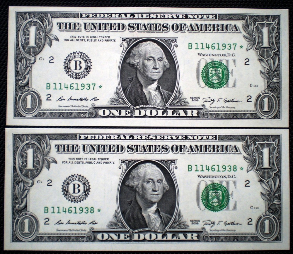 104 USA SUA 2X1 DOLLAR 2009 SERII CONSECUTIVE SR. 937-938 AUNC STEA STAR NOTE