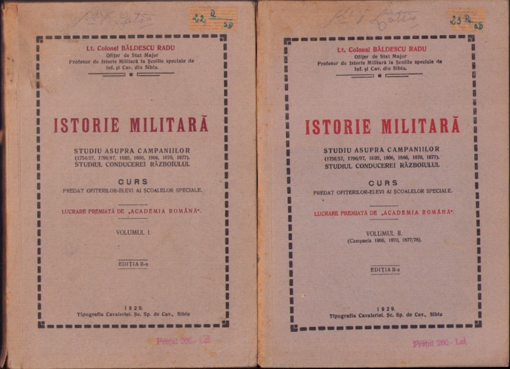 1074SPN Istorie militară, studiu asupra campaniilor (1756/57, 1796/97, 1805, 1808, 1866, 1870, 1877) Băldescu Radu, vol I + II 1928