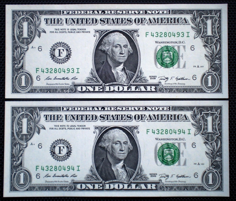 2X1 DOLLAR 2009 SERII CONSECUTIVE SR. 493-494. BANCNOTE LUATE DIRECT DIN TEANC.