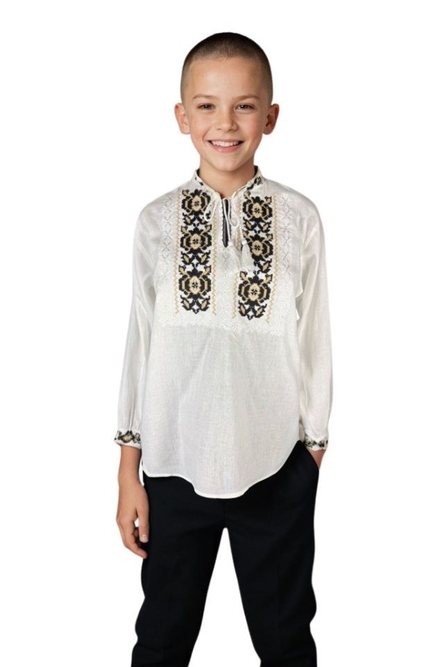 Bluza baieti CPB alb/crem Ie baieti alba cu broderie alegerea inspirata pentru tinutele tale deosebite. Acest model de ie pentru copii este cu maneca lunga cu broderie unicata. Ia este din bumbac 100% si are broderie atat pe maneci cat si piept. Modelul acesta de ie traditonala pentru copii are broderie in partea din fata si pe maneci cu motive traditionale colorate. Ia traditionala alba este perfecta pentru cine vrea sa combine traditia romaneasca cu modernitatea contemporana intr-un articol vestimentar unicat. Iile populare pentru copii sunt la mare cautare si vin sa intregeasca tinutele tale traditionale. Mărime – Circumferința bust – Lungime 4 ani: 75–79 cm | 46 cm 6 ani: 80–85 cm | 48 cm 8 ani: 86–89 cm | 50 cm 10 ani: 90–95 cm | 52 cm 12 ani: 96–99 cm | 54 cm 14 ani: 100–105 cm | 56 cm 16 ani: 106–109 cm | 58 cm