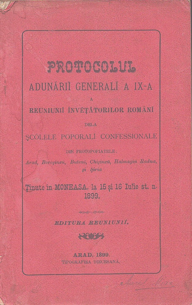 1351SPN Protocolul adunării generali a IX-a a Reuniunii Învățătorilor Români dela școlele poporali confessionale din protopopiatele ... 1899 Arad