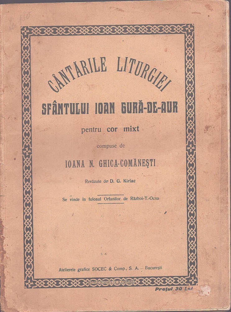 1400SPN Cântările Liturgiei Sfântului Ioan Gură de Aur pentru cor mixt compuse de Ioana Ghica-Comănești, revăzute de D G Kiriac, fără an