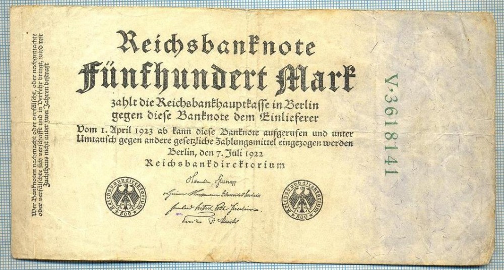 1776 BANCNOTA - GERMANIA - 500 MARK - anul 1922 -SERIA 3618141 -starea care se vede