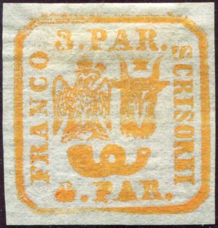 1862 , Lp 8 c , Principatele Unite 3 Parale portocaliu , hartie vargata- N.G.
