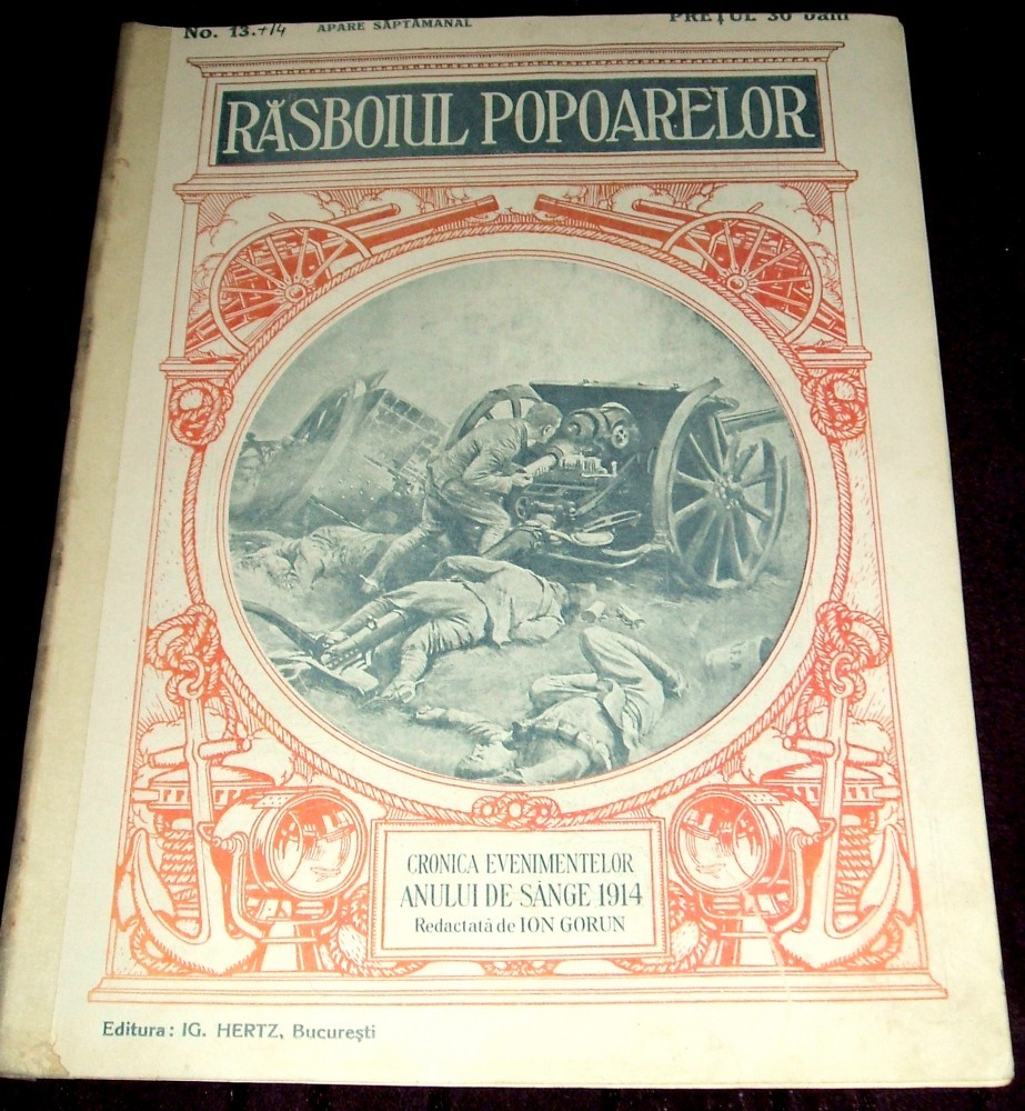 "Razboiul popoarelor" Nr. 13-14/1914 - revista saptamanala, editata de I.G. Hertz si redactata de Ion Gorun, dedicata teatrelor de operatiuni ale Primului Razboi Mondial. Revista are 28 pagini in format A4 si este bogat ilustrata.