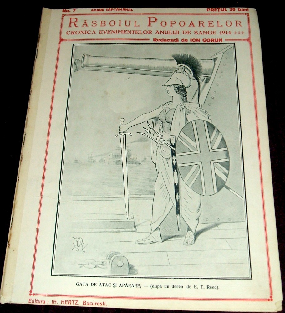 "Razboiul popoarelor" Nr. 7/1914 - revista saptamanala, editata de I.G. Hertz si redactata de Ion Gorun, dedicata teatrelor de operatiuni ale Primului Razboi Mondial. Revista are 12 pagini in format A4 si este bogat ilustrata.