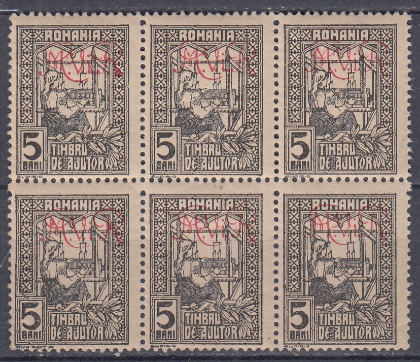 1917/1918 TIMBRE DE AJUTOR FISCAL/POSTALE SUPRATIPAR MVIR BLOC DE 6 TIMBRE MNH