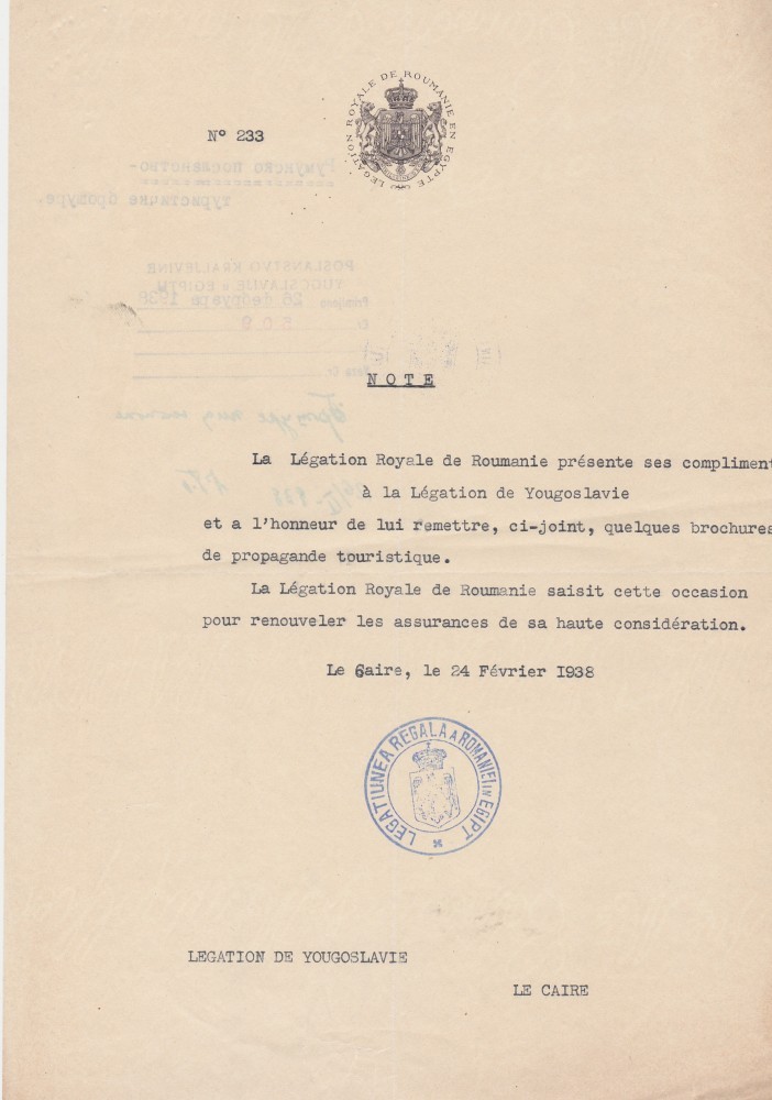 1938 Document Oficial – Legația Regală a României în Egipt către Legația Regatului Iugoslaviei – Propagandă Turistică, Cairo, Ștampile Ambasade