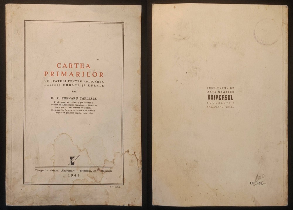 1941 CARTEA PRIMARILOR –Dr. C. Poenaru Caplescu 208 pag ilustrata. Edilitare, Aplicarea Igenei Urbane si Rurale... 23x16 Stare buna Coperta uzata