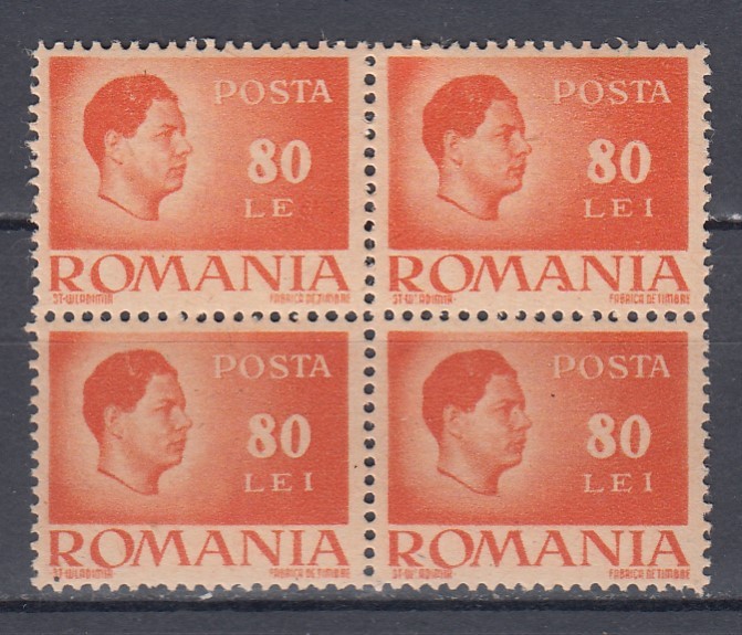 1945 LP 188 UZUALE MIHAI I VALOAREA 80 LEI CU EROARE LE HARTIE GRI BLOC DE 4