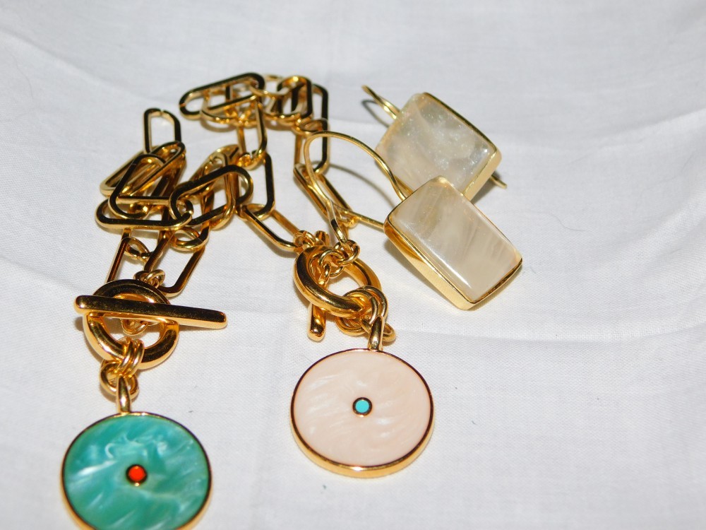 2 bratari noi, superbe, pentru a fi purtate impreuna, metal placat cu aur , email ,multicolor, cercei noi asortati cadou, curier inclus,