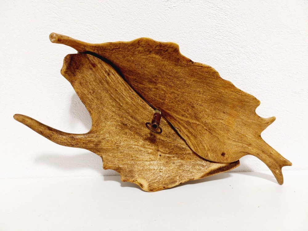 2 coarne de cerb lopatar imbinate si cu o tija metalica de cupru la mijloc pentru agatat- se pot transforma intr-un obiect decorativ rustic (gen candelabru, lampa, etc)