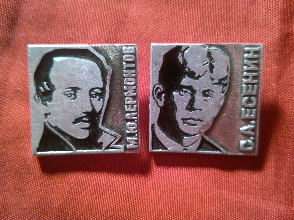 2 Insigne URSS - Portret Scriitori rusi : Esenin si Lermontov , metal si email , h=2,1cm *