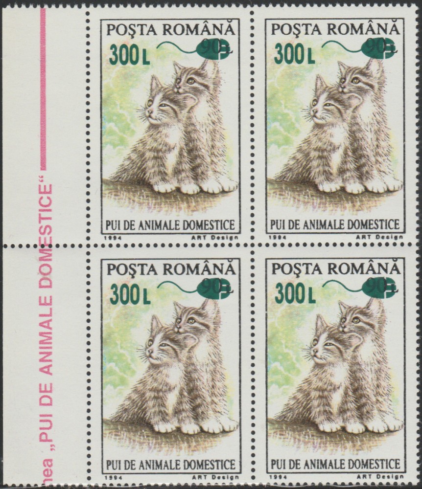 LP 1564 - ”Pui de animale 1994 (supratipar mouse)”, serie compusa dintr-o valoare supratiparita, in bloc de 4 timbre nestampilate din lateralul colii, cu guma originala, in stare excelenta.