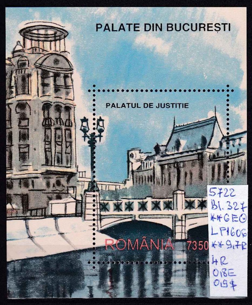 2003 Palate din București Bl.327 LP1606 MNH. Poate fi comandat la prețul de 3 Lei/coliță. Încerc să păstrez prețurile emisiunilor listate de mine la cota cea mai minimă din Okazii, însă din cauza politicii de comisionare de min.1Ron/emisiune, nu le pot lista la aceste prețuri minimale, pierderea ar fi enormă. Astfel Prețul emisiunii listat se compune din valoarea emisiunii + taxele obligatorii. Livrare personal în Miercurea Ciuc, prin poștă cu ramburs (aprox. 17 Ron) sau prin poștă în scrisoare recomandată cu plată anterioară în cont bancar (aprox. 6Ron), iar costurile poștale vor fi suportate de către cumpărător.