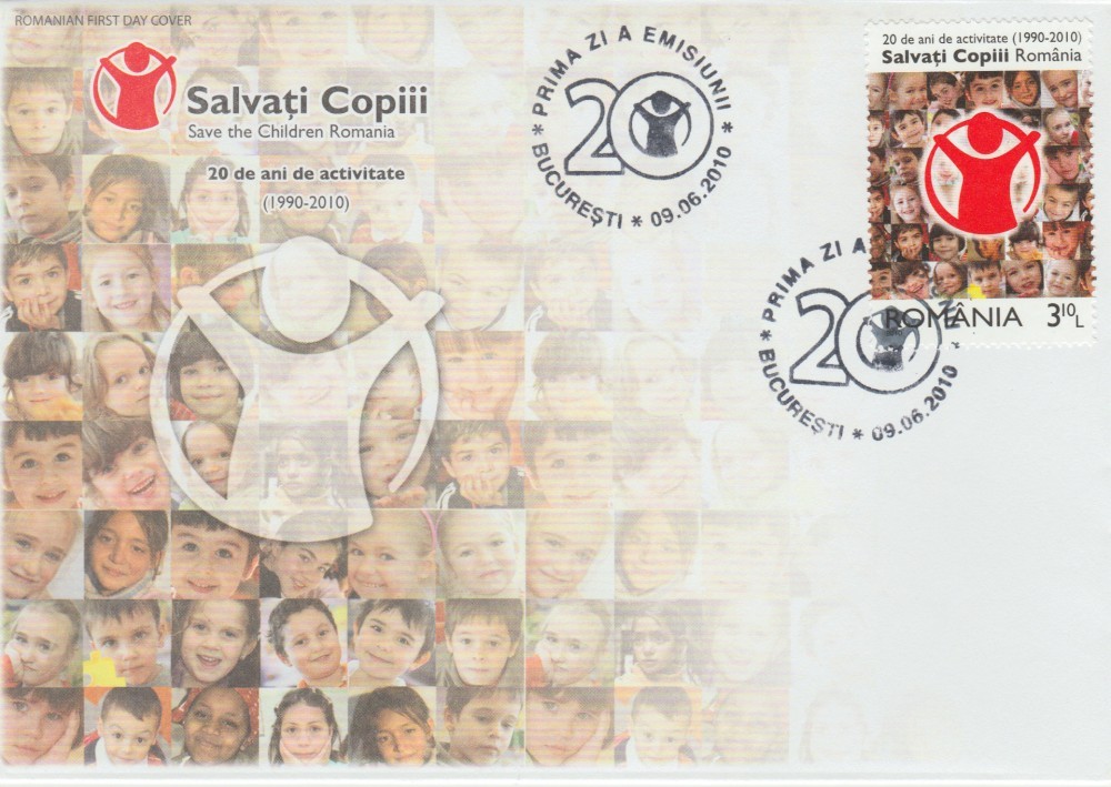 Plic FDC cu seria "Organizatia Salvati Copiii Romania - 20 de ani de activitate" (LP 1867), emis in 2010 cu stampila prima zi a emisiunii.