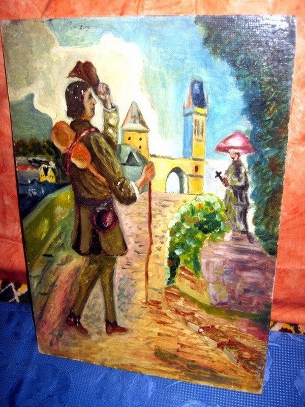 237-Tablou vechi naiv-Cavaler cu vioara salutand doamna la intrare in cetate. Ulei pe placaj, inaltime 37 cm, latime 30 cm, in stare generala buna, in patina timpului.