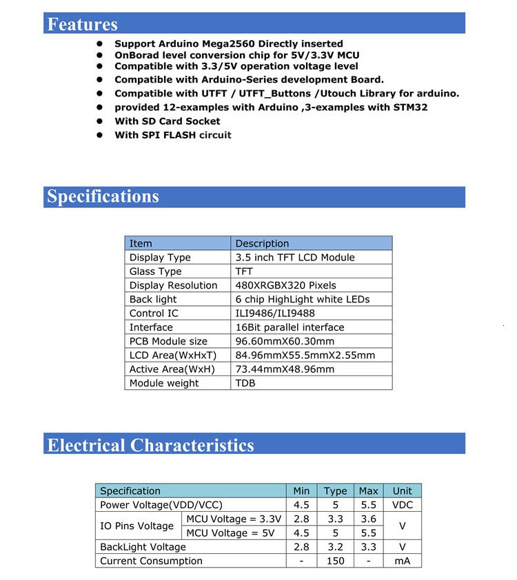 3.5 inch TFT LCD screen module Ultra HD 320X480 for MEGA 2560 R3 Board