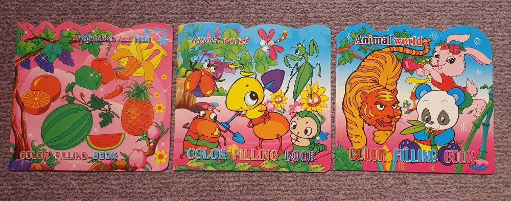 3 carti de colorat, Animal World, Insect World, Vegetables and Fruit, ca noi