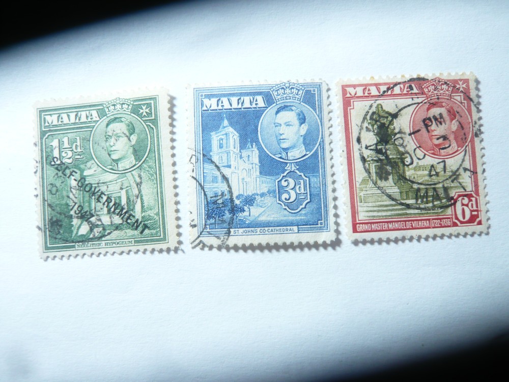 3 Timbre Malta Rege George VI , motive locale : 6p 1938 ,3p1943 si 1 1/2p 1953 s