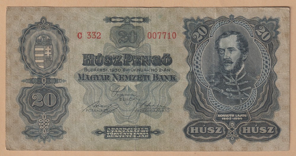BANCNOTA UNGARIA - 20 PENGO 1930 (2 IANUARIE 1930), PORTRET LAJOS KOSSUTH