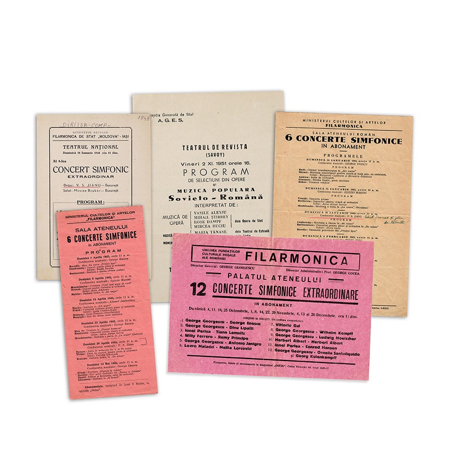 Cinci fluturași publicitari care anunță diverse concerte simfonice care au avut loc între 1940 și 1948 la Ateneul Român, Teatrul Național din Iași, Teatrul de Revistă Savoy din București. La Ateneul Român concertele erau susținute de Filarmonica din București alături de George Enescu și dirijorul George Georgescu. 25 x 17; 21,5 x 15,5; 24,5 x 11,5; 16,,5 x 23,5 cm