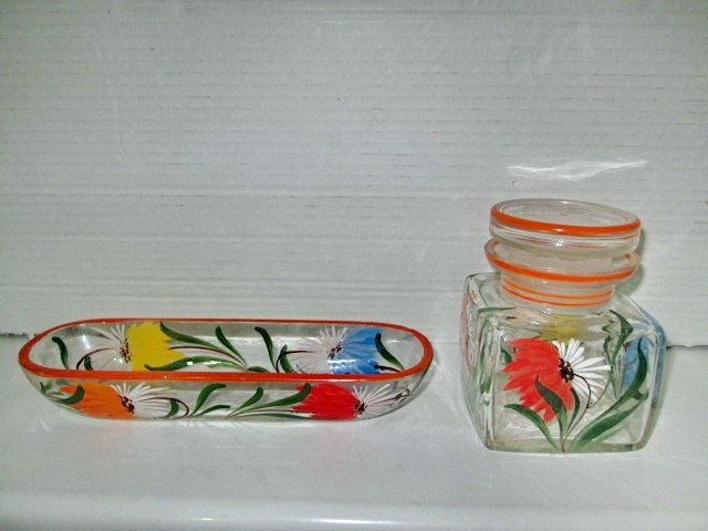 5061-I-Set condimente vechi interbelic sticla manual pictat cu design floral. Borcan de condiment marimi: inaltime 11.5cm, patratic 8.5cm. Sosiera 12.5/7/4cm. Greutate 820 grame. Stare generala buna, sosiera are cateva minuscule lovituri pe margine.