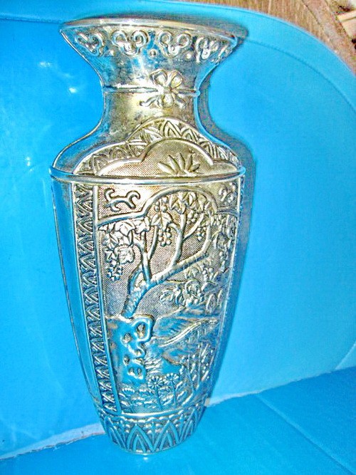 Vaza veche in metal alb avand design natural in relief rustic cu pomi. Inaltime 12 cm, latime 10 cm, adancime 8 cm, greutate 650 grame.