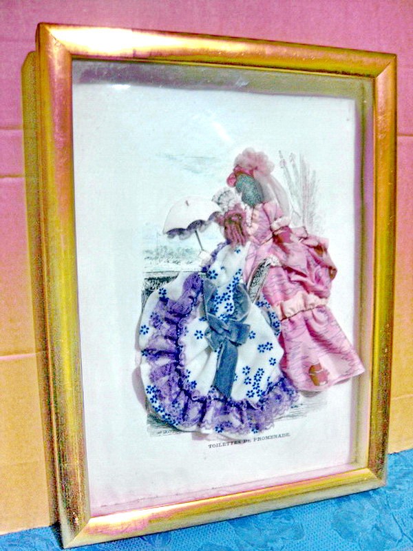 6408-Aplica lucrare in relief E. Prevai-Toilettes de Promenade. Tehnica mixta: creion si panza lucratura pe carton in caseta in relief cu geam original. Stare buna putin murdara pe cantul de jos al ramei, necesitand putina curatire, lucrarea in stare buna. Marimi 41_31 cm. Rama din lemn aurit original.