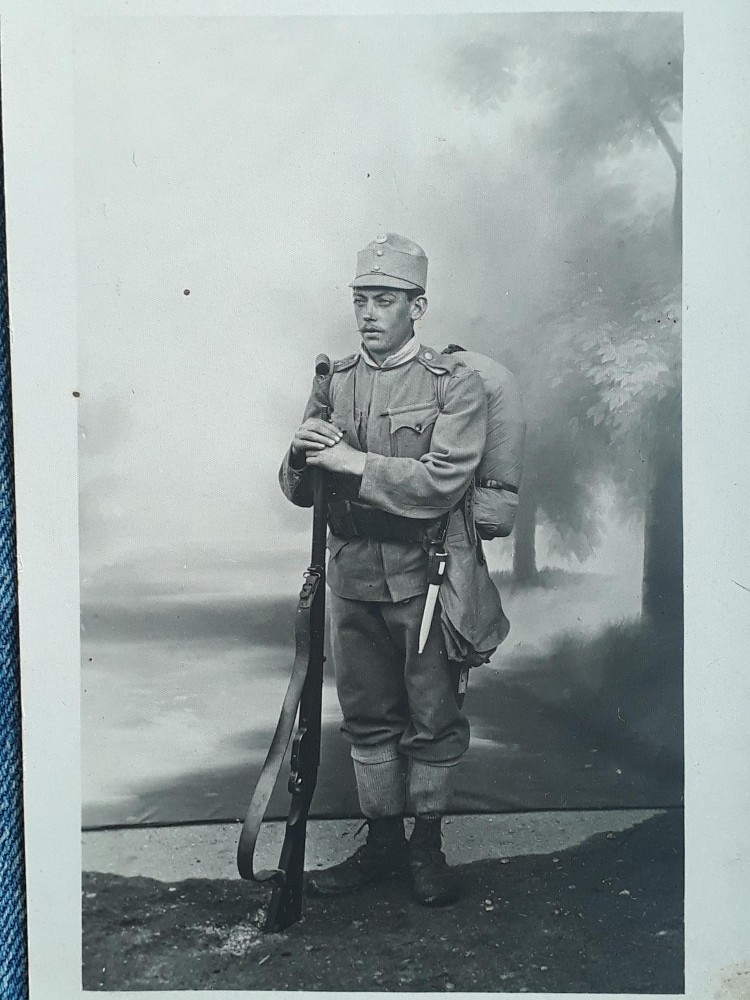 663 - Fotografie soldat in uniforma cu pusca si baioneta ersatz , echipament WW1