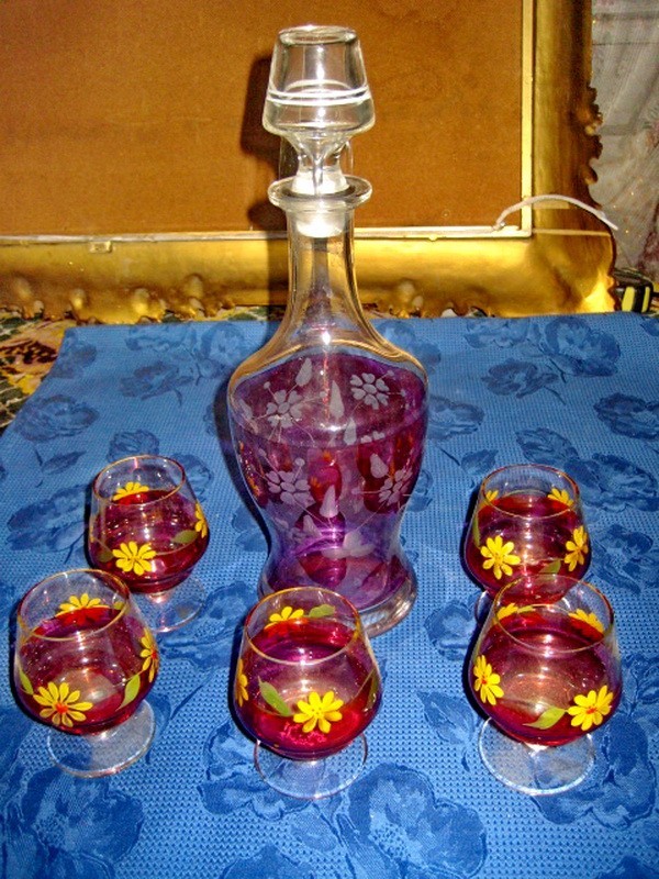 723A-Set servit tuica vechi sticla+5 pahare fond bordo.