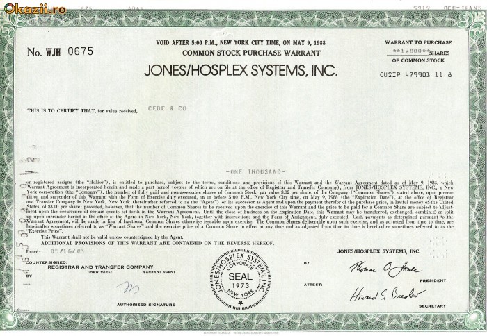 736 Actiuni -JONES/HOSPLEX SYSTEMS, INC. -seria WJH 0675