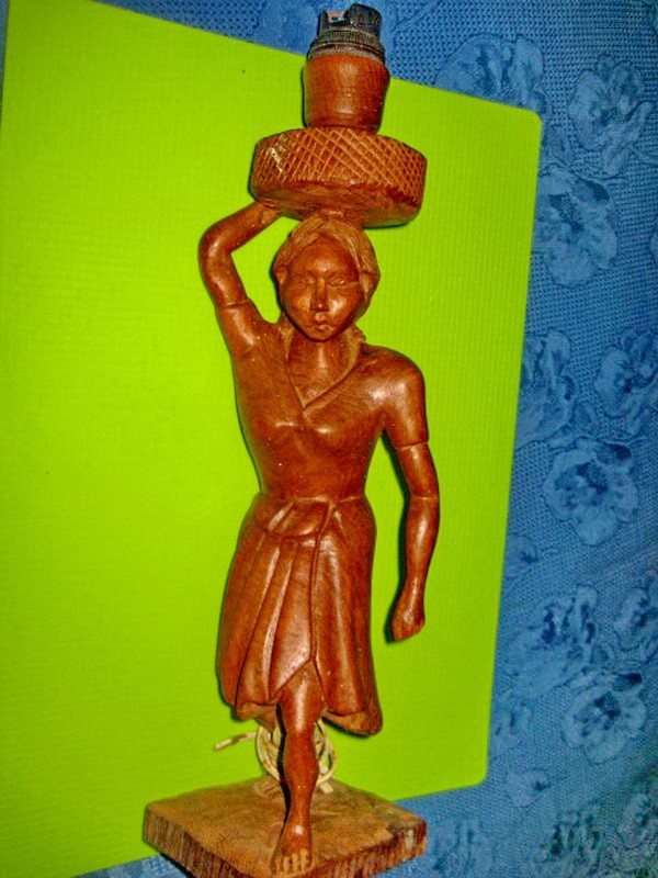 Statuieta veche Africa- Femeie cu cofa lemn masiv. Provenienta Franta, anii 1900, adusa probabil din coloniile franceze, transformata in lampa fara a schimba starea statuietei, se poate folosi ca atare sau desfiinta lampa fara probleme. Inaltime 35 cm, latime 10, baza 13 cm.