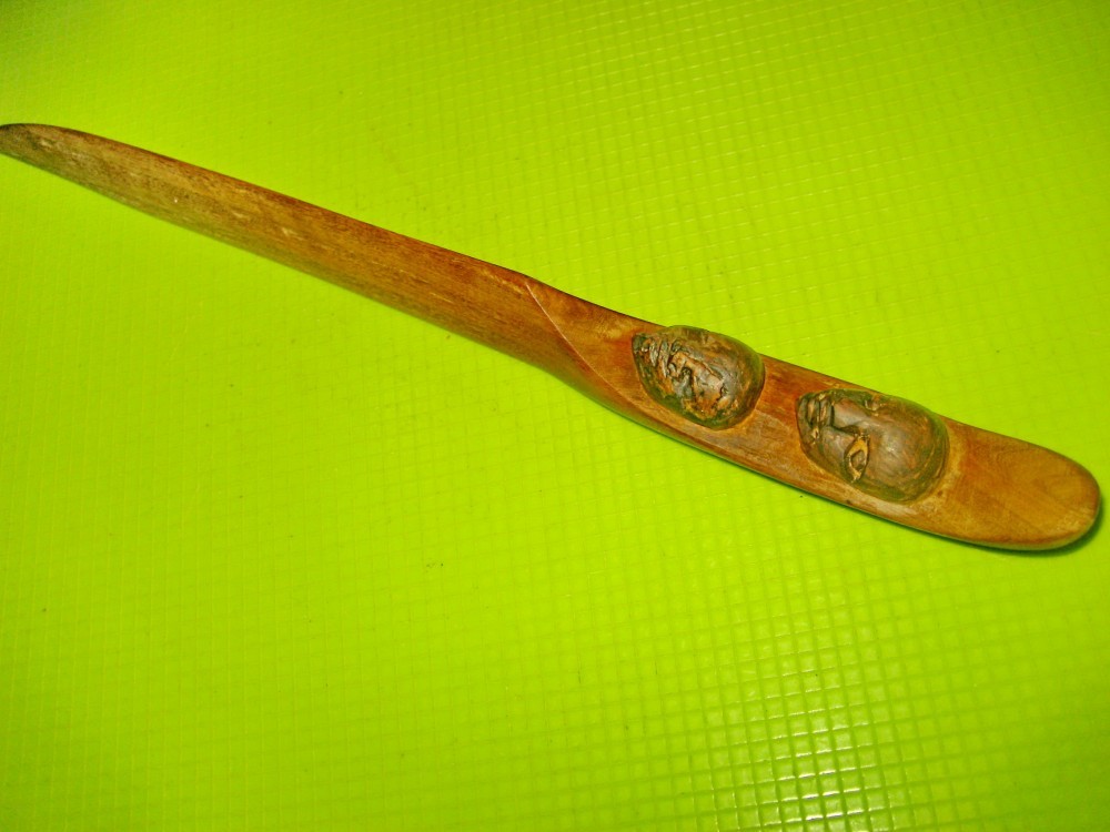 9769-Cutit birou capete oameni Africa deschis scrisori lemn masiv manual sculptat. Lungime 28 cm, latime lama 3 cm, grosime maner 2.5 cm. Stare generala buna cu mic defect la un ochi.