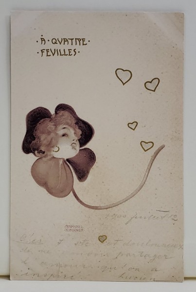 A QUATRE FEUILLES , CROMOLITOGRAFIE DUPA O GRAVURA de RAPHAEL KIRCHNER , CARTE POSTALA , CLASICA