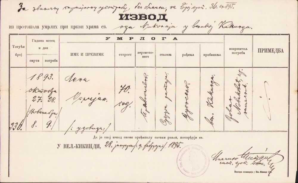 Extras registru biserică, 1895, Chichinda Mare, în limba sârbă