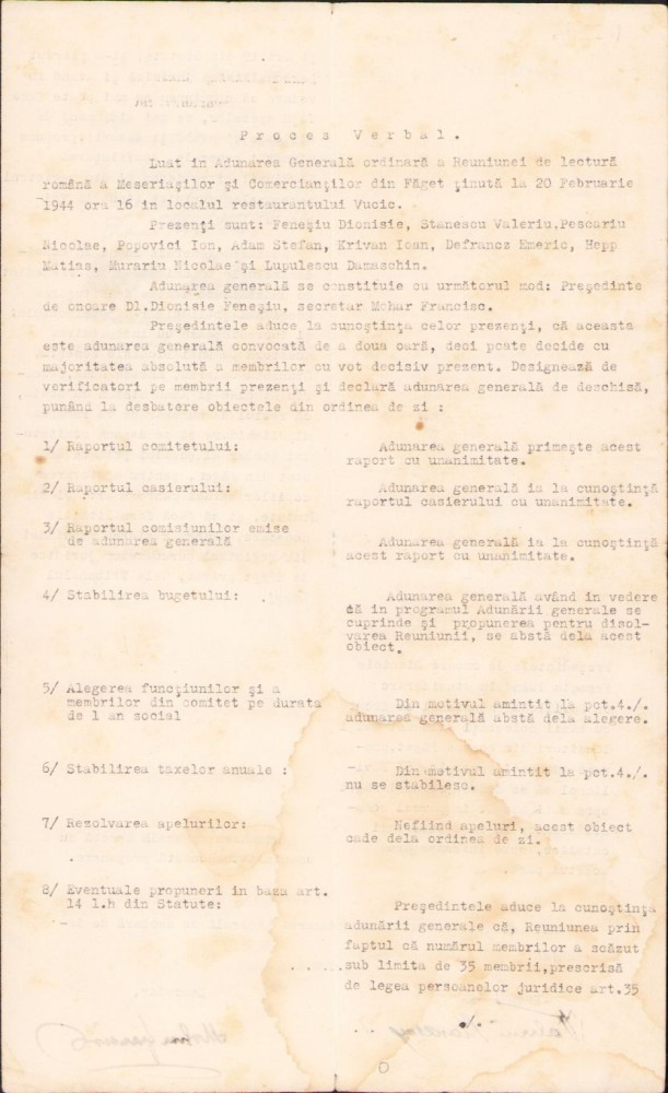 A1332 Act Reuniunea de lectură română a Meseriașilor, Făget, județul Timiș, 1944