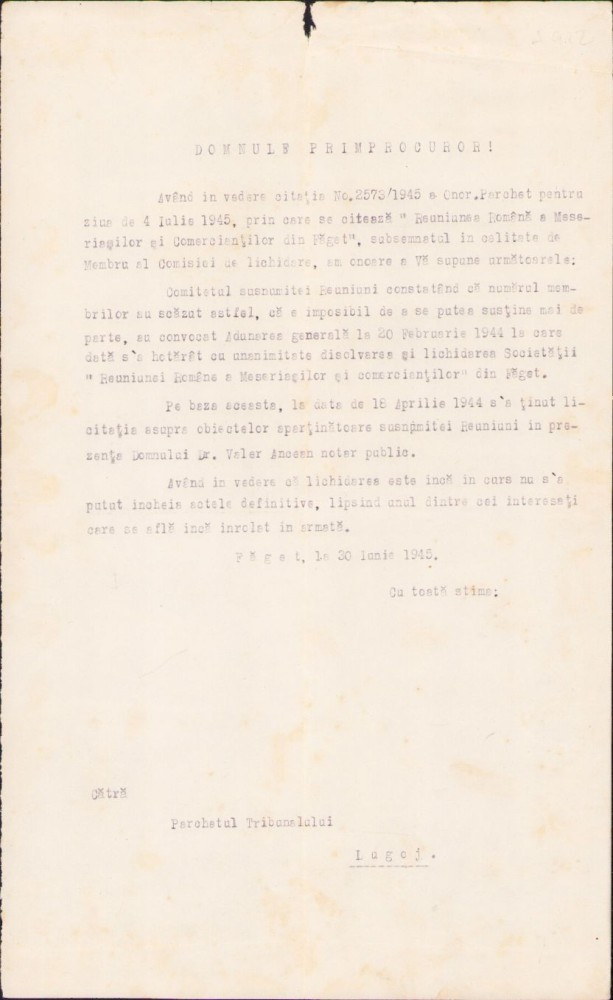 Act Reuniunea Română a Meseriașilor și Comercianților, Făget, județul Timiș, 1945
