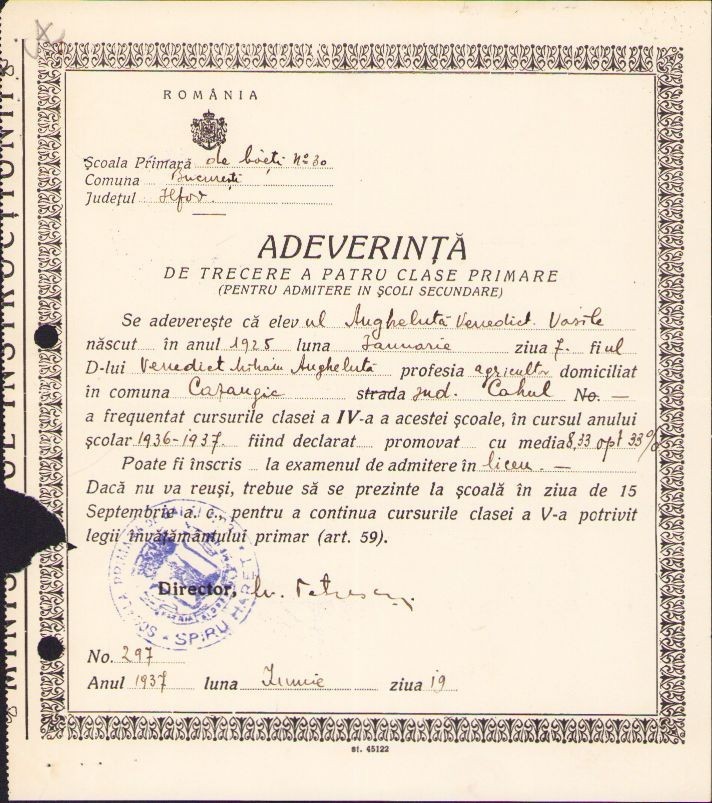 Atestat de absolvire 4 clase primare, București, școala nr. 30, 1937