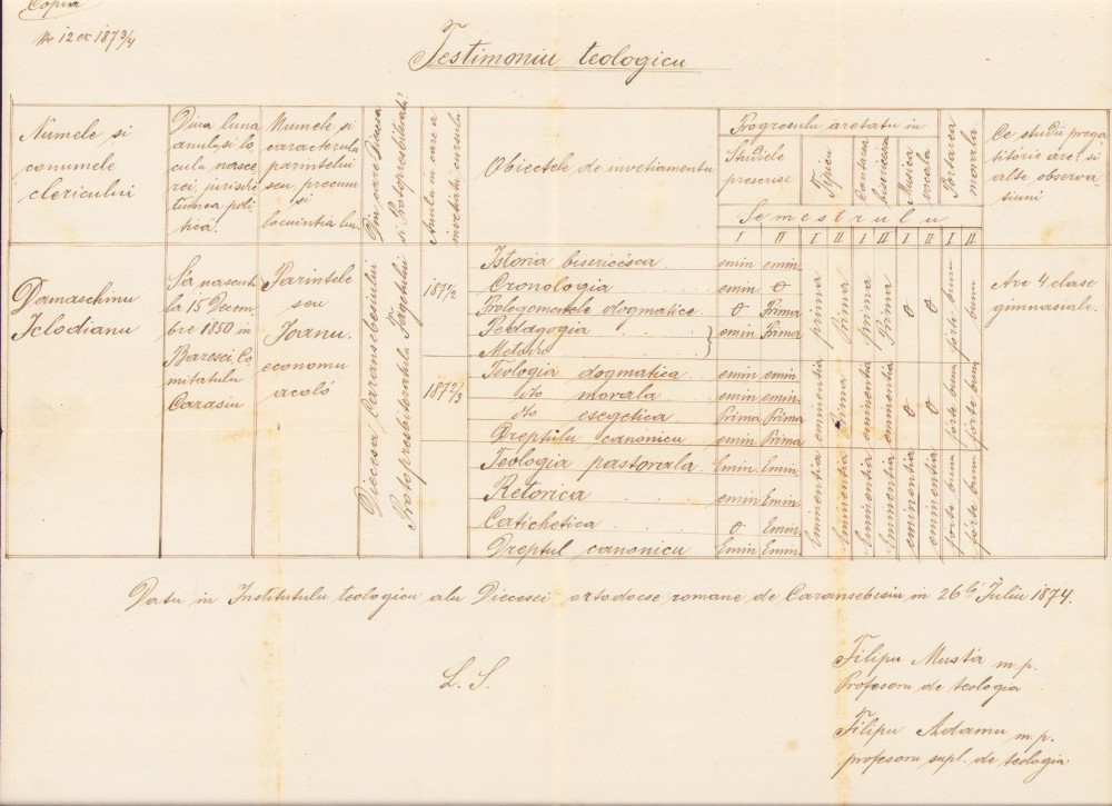Testimoniu teologic Caransebeș, copie de epocă, 1874