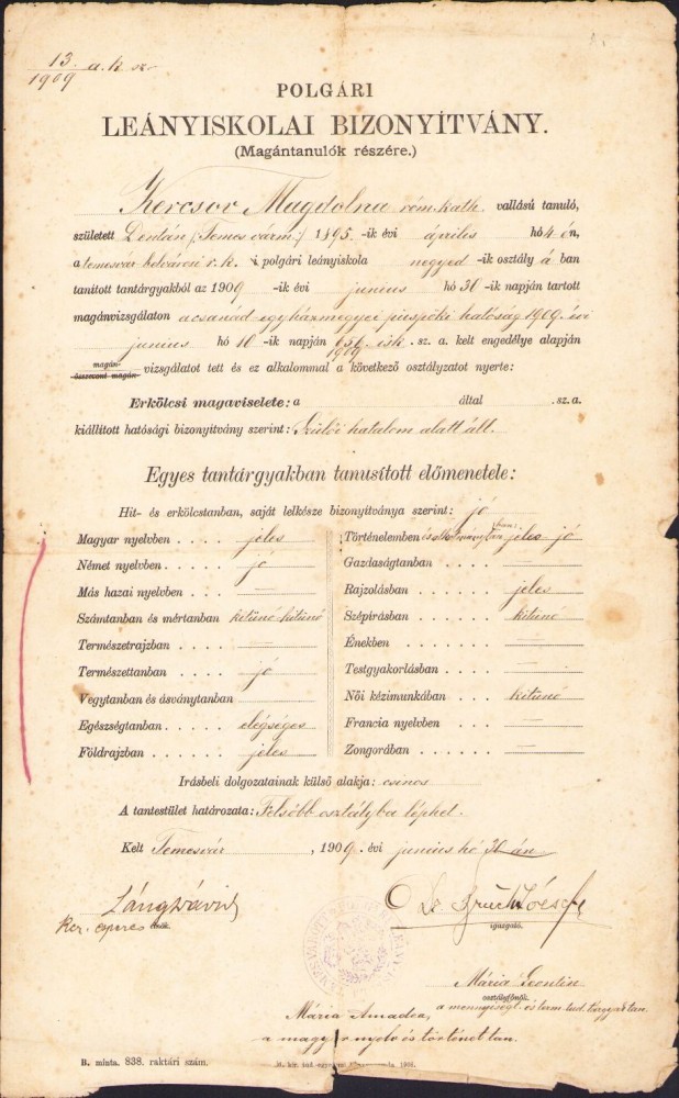 Certificat școlar, 1909, Timișoara.