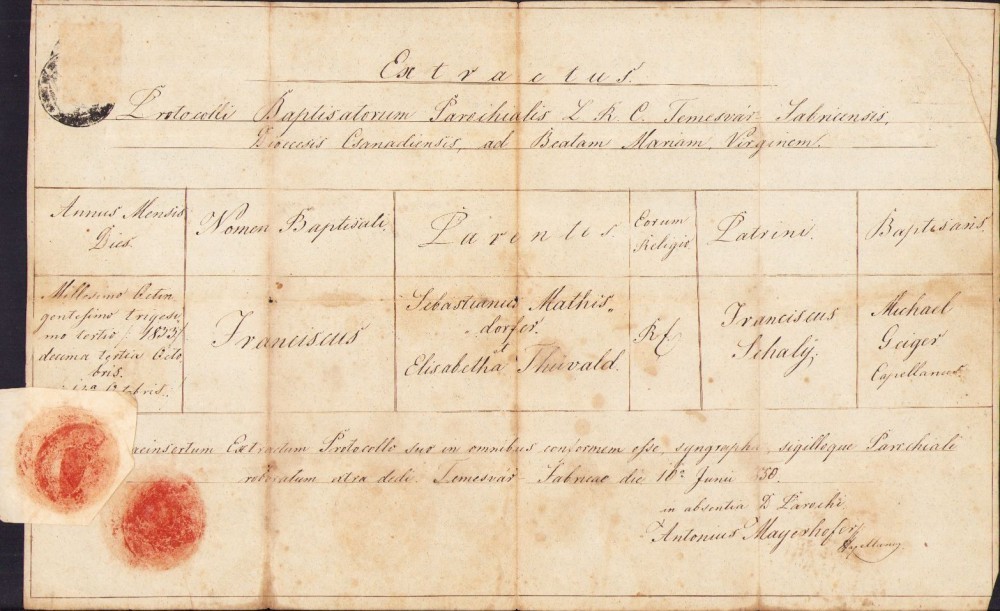 Extractus Protocolli Baptisatorum, 1850, Timișoara Fabric