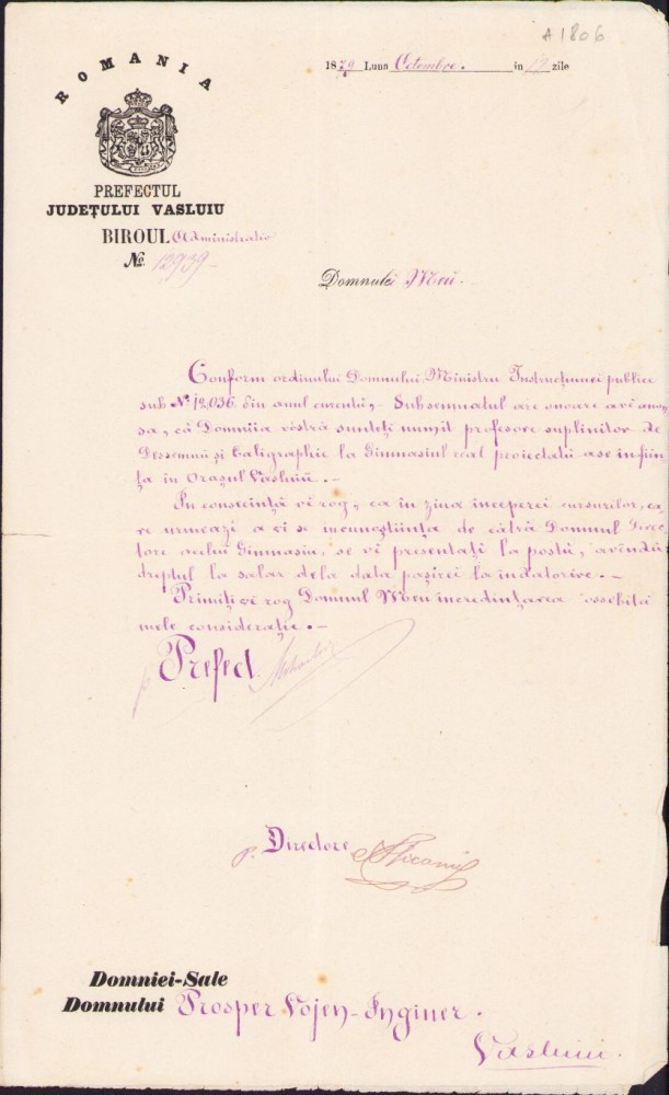 A2044 Numire de profesor suplinitor, 1879, gimnaziu, Vaslui