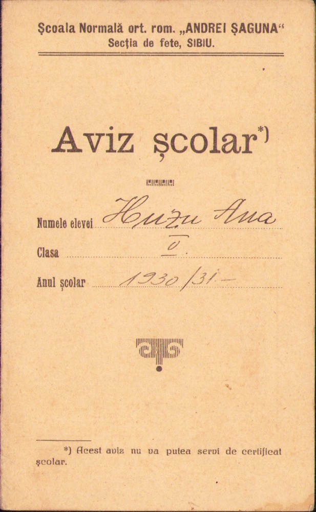 Aviz școlar 1930 Școala Normală ortodoxă română Andrei Șaguna Sibiu