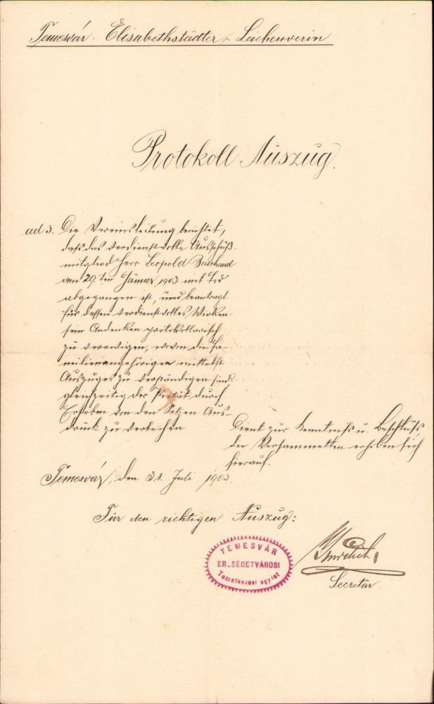 Protocol Asociațiunea Funebrală Elisabetin Timișoara, 1903