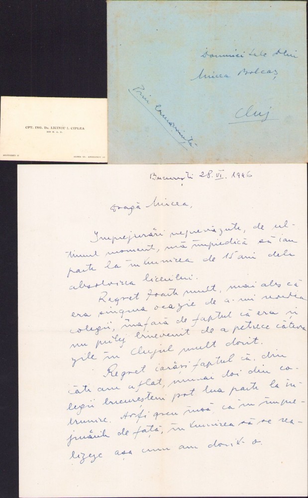 Cartea de vizită a prof. univ. dr. Liciniu Ioan Ciplea și scrisoare scrisă manu propria, 1946.